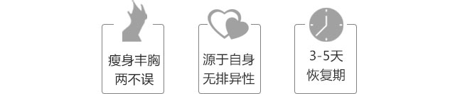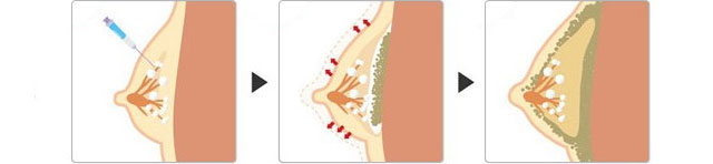 吸取在腹部或大腿处深层多余脂肪,经特殊处理后,将高纯度、高活力的多功能细胞及生长因子的脂肪颗粒分层、分点交叉、多隧道、多平面维度地精密到胸部,达到丰胸的效果,使乳房丰满、有形。