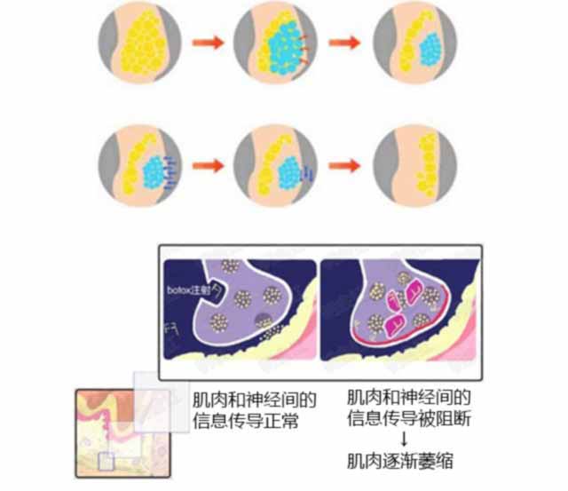 (Botox)通过作用于胆碱能运动神经的末梢,以某种方式拮抗钙离子的作用,干扰乙酰胆碱从运动神经末梢的释放,通过暂时抑制支配肌肉运动的神经,可使小腿肌肉不发达。同时,利用“失用性萎缩”的原理,使肌肉体积缩小,小腿变细,修长秀美。